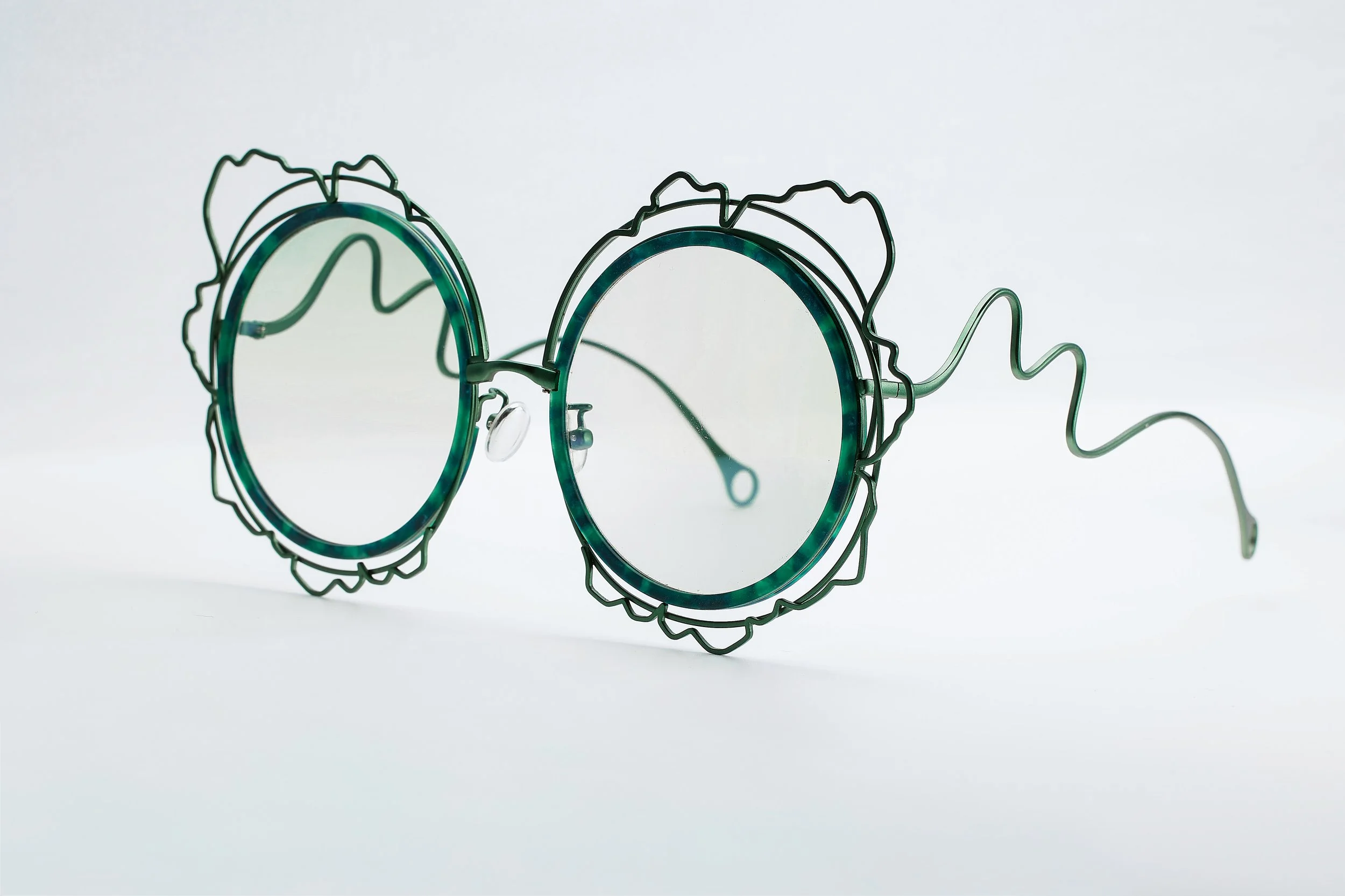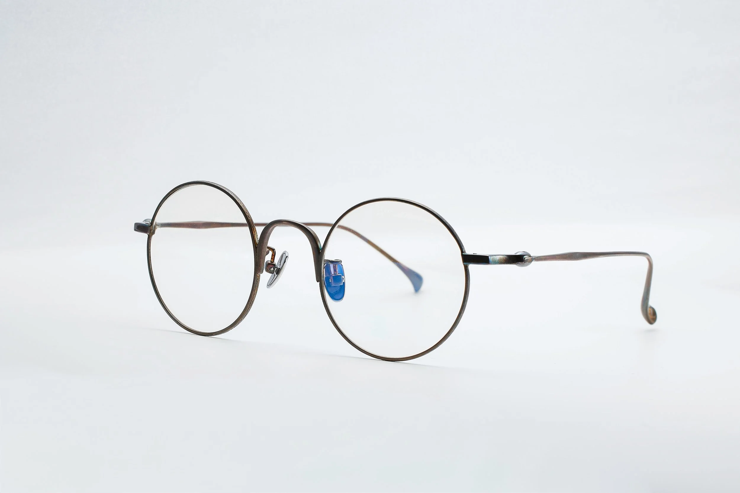 Eyewear Collection Titanium High-Quality Two-Tone IP Plating Titanium Vintage Round Frame in Oxidized Antique Bronze Titanium Sideshield Structure Titanium Plate with “神” Character Cutout Windsor Rim with Titanium Structural Design Titanium Engraving flower pattern